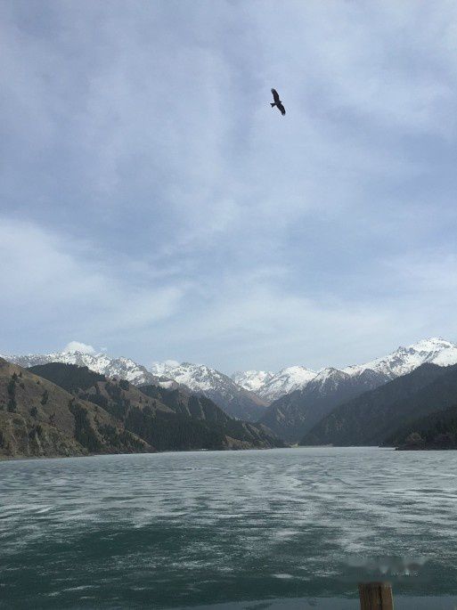 远处的白雪皑皑的山头和结冰湖面相互映衬,似乎有个词句特别贴切。