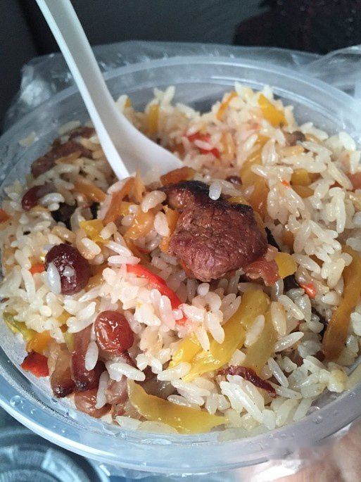 上飞机前,来个地道的手抓饭,哎呦呦,满满的羊肉,加上干果、胡萝卜和羊油,又香又好吃:)