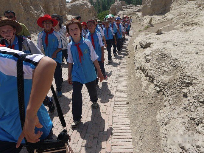 路上看到新疆小学生来此参观学习,温度很高,太阳很晒,小朋友排队井然有序,维吾尔语很像法语一般,软软的很好听。
