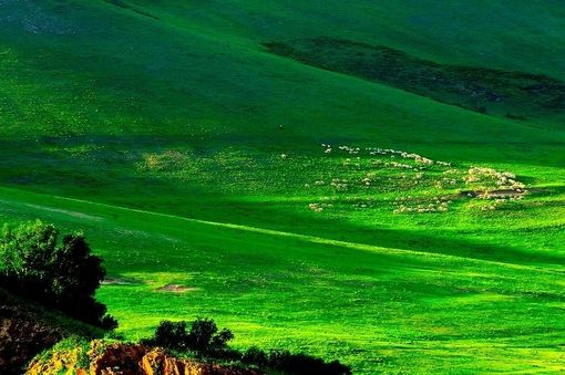 自幼就见过“天苍苍,野茫茫,风吹草低见牛羊”这类的词句。这曾经发生过不太好的影响,使人怕到北边去。这次,我看到了草原。那里的天比别处的天更可爱,空气是那么清鲜,天空是那么明朗,使我总想高歌一曲,表示我的愉快。在天底下,一碧千里,而并不茫茫。四面都有小丘,平地是绿的,小丘也是绿的。羊群一会儿上了小丘,一会儿又下来,走在哪里都象给无边的绿毯绣上了白色的大花。那些小丘的线条是那么柔美,就象没骨画那样,只用绿色渲染,没有用笔勾勒,于是,到处翠色欲流,轻轻流入云际。这种境界,既使人惊叹,又叫人舒服,既愿久立四望,又想坐下低吟一首奇丽的小诗。在这境界里,连骏马与大牛都有时候静立不动,好象回味着草原的无限乐趣。紫塞,紫塞,谁说的? 这是个翡翠的世界。连江南也未必有这样的景色啊!