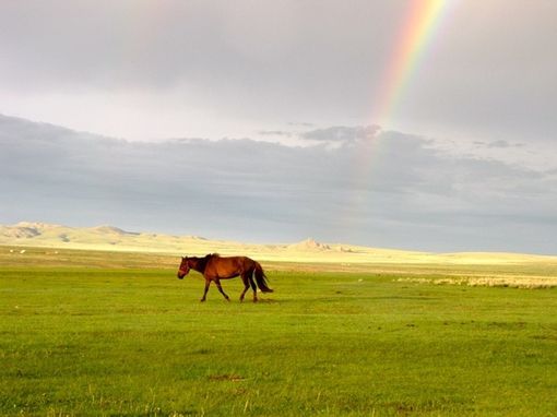 我们访问的是陈巴尔虎旗的牧业公社。汽车走了一百五十华里,才到达目的地。一百五十里全是草原。再走一百五十里,也还是草原。草原上行车至为洒脱,只要方向不错,怎么走都可以。初入草原,听不见一点声音,也看不见什么东西,除了一些忽飞忽落的小鸟。走了许久,远远地望见了迂回的,明如玻璃的一条带子。河!牛羊多起来,也看到了马群,隐隐有鞭子的轻响。快了,快到公社了。忽然,象被一阵风吹来的,远丘上出现了一群马,马上的男女老少穿着各色的衣裳,马疾驰,襟飘带舞,象一条彩虹向我们飞过来。这是主人来到几十里外,欢迎远客。见到我们,主人们立刻拨转马头,欢呼着,飞驰着,在汽车左右与前面引路。静寂的草原,热闹起来:欢呼声,车声,马蹄声,响成一片。车、马飞过了小丘,看见了几座蒙古包。