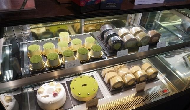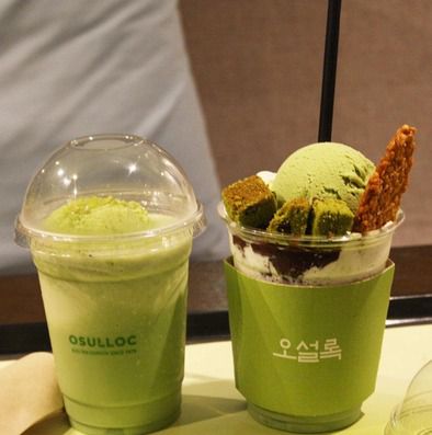 是用济州岛绿茶做的各种饮品和甜点,带有浓浓的绿茶香气。