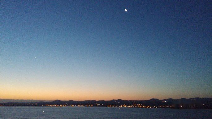 随着船慢慢靠码头,另一边的天色出现了红晕。