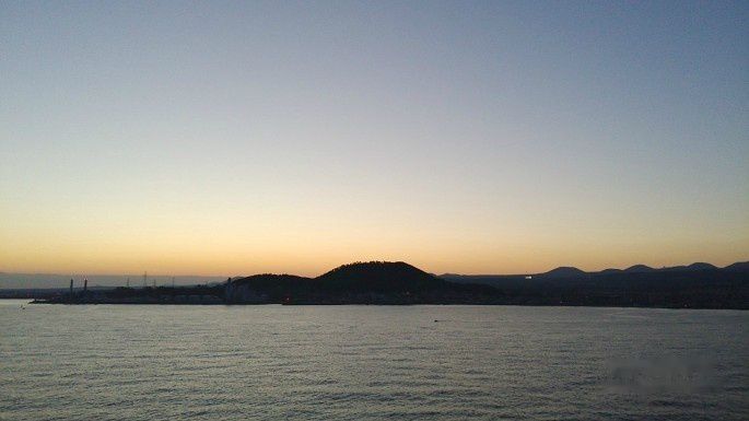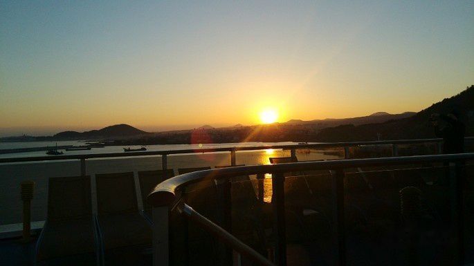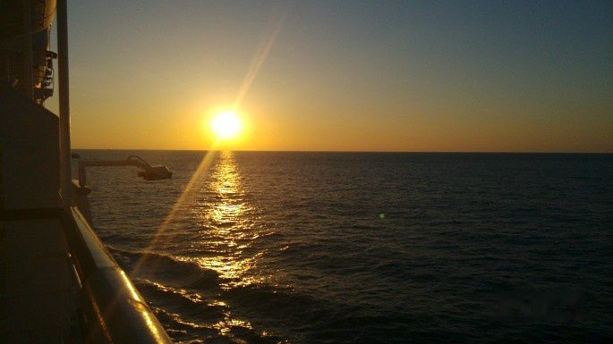 拿到每个人的护照回来的路上正好经过三楼甲板,看到了最后一天的海上落日。虽然因为准备各种离船手续而匆匆忙忙,忙里偷闲能张望一眼,也是缘分。