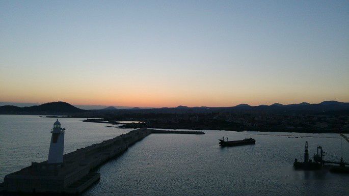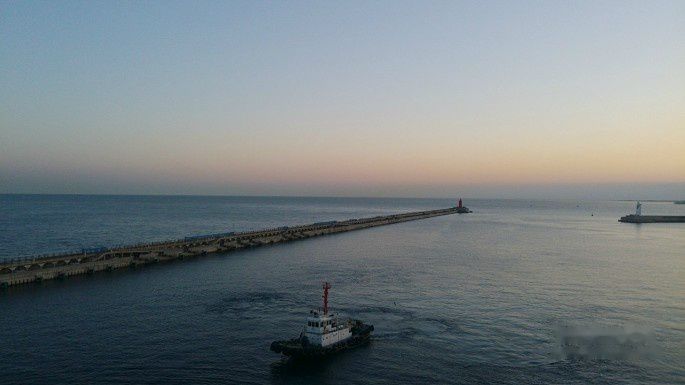 这时候天还蒙蒙亮,船还没有完全到港。但是船速已经很慢了,船一点也不晃,非常平静。
