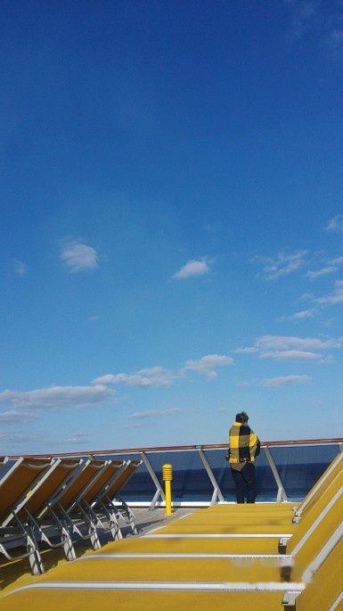 吃饱喝足后,让大人们坐在游泳池旁边的观景台上看人家教跳舞,我一个人跑到甲板的躺椅上,享受最后的蓝天白云。