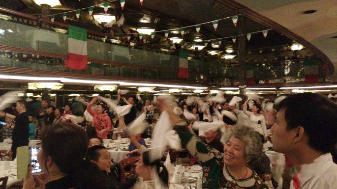 吃到一半,餐厅突然骚动了起来。我本来以为像前两天一样,有个唱京剧的表演一下什么的,结果是每一位服务员都会邀请一位女士(通常是阿姨妈妈)一起起舞。随后一列小火车就开起来了,许多年轻年老的吃了一半都放下了刀叉,加入了小火车的队伍。跳了一会儿舞以后,又从里面走出一队拿着烟花的服务生,站在走廊两边一边唱歌一边放小烟花。(其实我那时候在想,不是烧菜都不能用明火么?为什么还点烟花?)那歌曲听不懂,但是看到从三楼垂下来的一面面绿白红旗子来看,应该是意大利的国歌之类。随后主持人出现,叫大家挥舞手中的餐巾一起加入欢呼。于是就看到以下这个群魔乱舞的场景:
