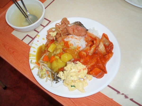 我们只好把泡菜、蔬菜、辣椒酱等全部拌进去,才显得好吃点。