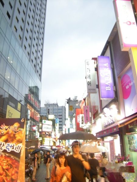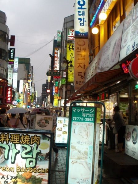 算得上世界上最有名的几条大街之一,有很多的服装店和化妆品店,各色餐厅也很多,但主要是韩食和日本料理居多,还有打扮时尚的年轻人。可惜真的是很大的雨,拍的很多都抖了 = = ||