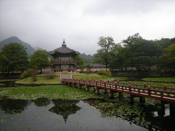 景福宫是朝鲜王朝(1392~1910年)时期韩国首尔(汉城)的五大宫之一,也是朝鲜王朝的正宫,它是朝鲜王朝的始祖——太祖李成桂(1392~1398年在位)于1395年将原来高丽的首都迁移时建造的新王朝的宫殿,具有500年历史。中国古代《诗经》中曾有“君子万年,介尔景福”的诗句,此殿籍此而得名,因位于首尔北部,也叫“北阙”。景福宫是首尔规模最大、最古老的宫殿之一,是韩国封建社会后期的政治中心。1592年日军入侵时将宫苑的大部建筑物破坏,到高宗5年(1868年)重建时只有10个宫殿保持完整。景福宫占地面积达15万坪(约合50公顷),呈正方形,南面是正门光化门,东面是建春门,西面是迎秋门,北面是神武门。