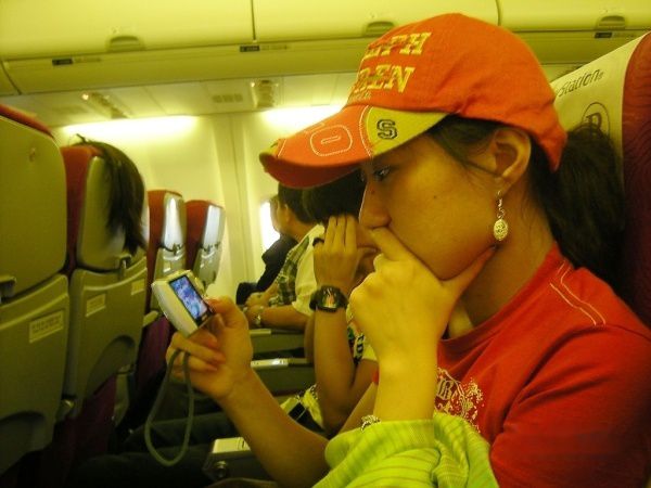 飞机上认真看照片的我,