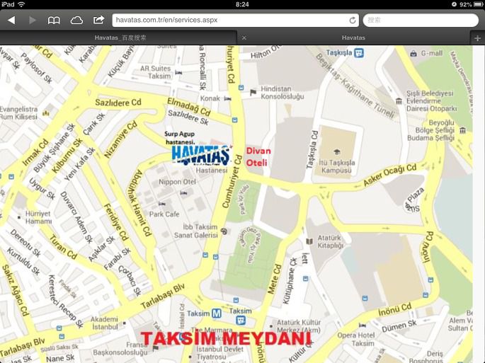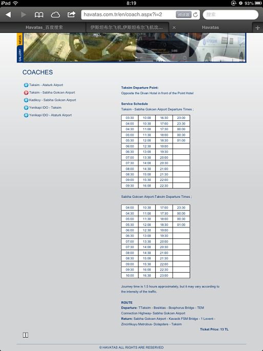 每半小时一班车去两个机场。清晨路况好的话从塔克西姆到亚洲机场大约45分钟左右,遇上塞车可能需要2小时。从欧洲机场坐地铁去市区全程也就30分钟,但晚上12点之后没有地铁。Havatas 伊斯坦布尔TAKSIM广场到SAW13TL每人。大家在网上查到的另一家公司Havas已经停止运营了。特别提醒一下!
