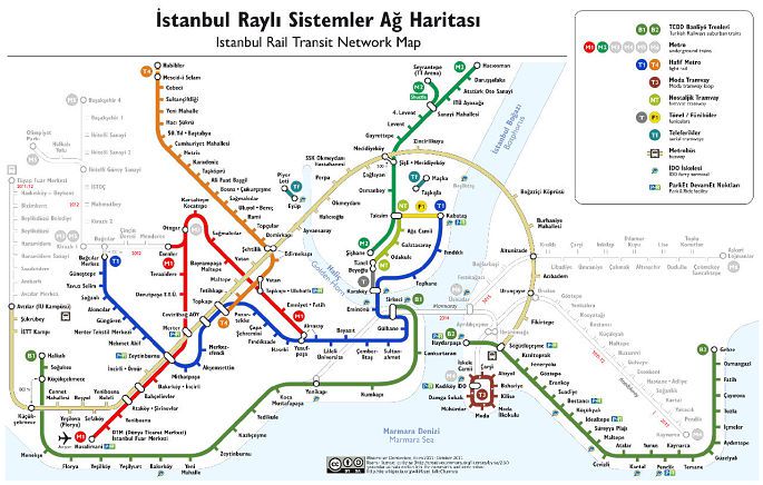 字母M加数字的地铁线路(Metro),分别为M1红线,M2绿线,M3蓝线,M4红综线和M5深棕线。M1红线从伊斯坦布尔 飞机场的地铁站Havalimani到市中心商业区Akasary,中间有两个换乘枢纽,一个连接老城区轻轨电车换 乘站Zeytinbumu,另一个是长途巴士总站换乘站Otogar。M2在市东北的新城区博斯普鲁斯海峡西岸区域。M3和M5位于市西北的新区,虚线 表示还没有通车,M4位于海峡对岸亚洲陆地 。