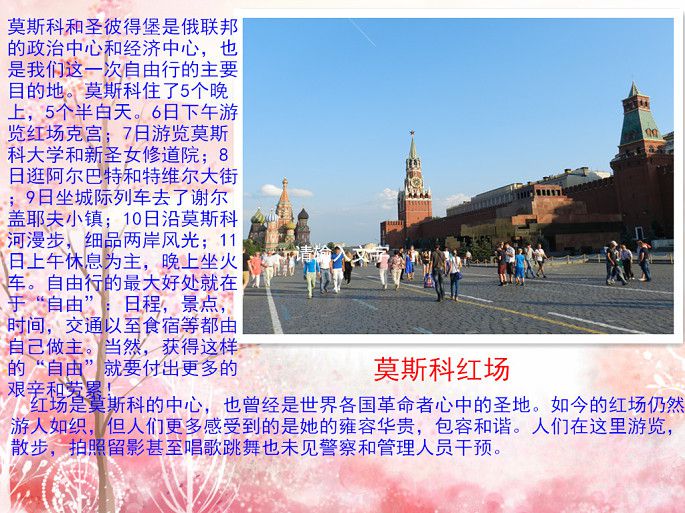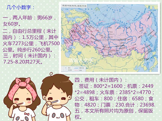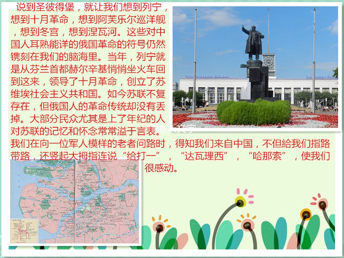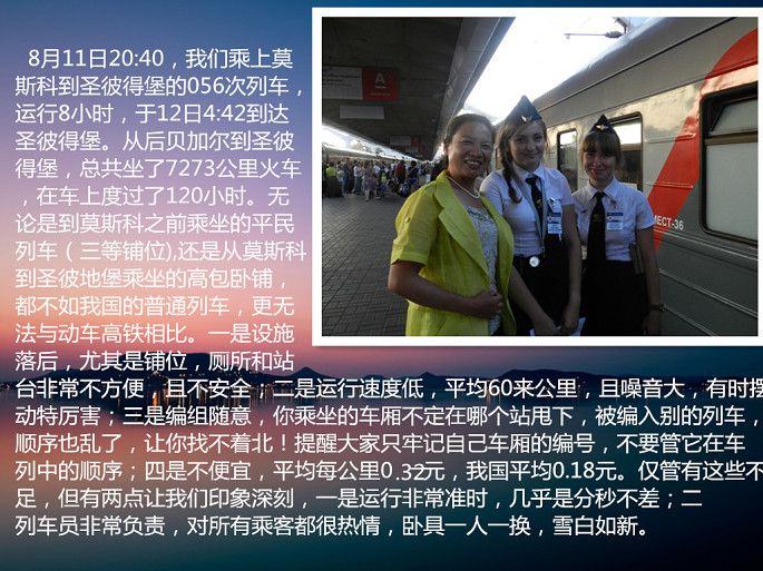 这次远行从筹划、准备到实施,每一步都碰到意想不到的困难,最大的困难就是语言不通。中学时学过几年俄语,但时隔半个世纪,早已丢光,仅凭依稀记得的字母读音和在出发前突记的几个单词去自购火车票、飞机票、找旅馆、乘地铁公交、购物谈价格等显然是‘’自不量力“!却又是开弓没有回头箭,必须奋力前行,义无反顾。随之而来的是:人变黑了;腰变细了、嘴变馋、心变实了、欲变小了。