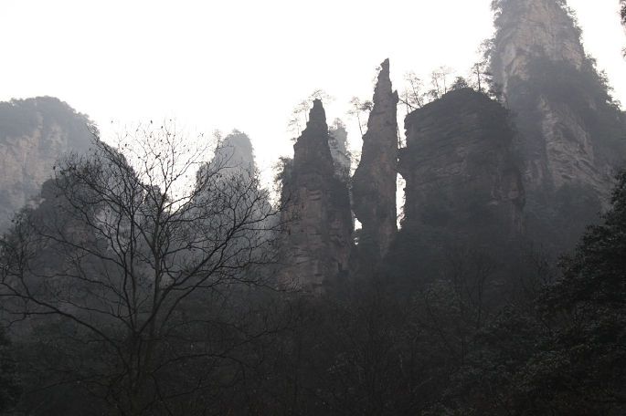 大概8点左右正式进入景区,按照计划,先沿着金鞭溪前行,记得上次来的时候是夏天,金鞭溪非常漂亮,天气也非常舒服。现在是冬天,景色果然不同,添了一些萧杀的味道。原本想来看看雪景的,可惜也没下雪。但既来之则安之,先呼吸一下新鲜空气再说。据说这里的空气是5美元/口,只要呼吸几口就把本赚回来了,呵呵。先来几张照片吧。