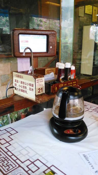 周记的设计还是很不错的,借用目前公司大力推行的6S管理,这里的看板建设非常好。首先,楼梯上来,一边触手可及的就是免费取阅的宣传册,非常精美,里面图文并茂地介绍了不少餐点。其次,每桌桌面上有个电子屏的点餐机,非常简易地介绍了一下基本的项目:茶位每人5元,不点餐点的,茶位每人10元;另外提醒,所有餐点需要下单后现蒸,所以等候时间比较长。再次,餐单上所有的点心后面都有一个标记,分别为小、中、大、特、顶、靓、精、美、贡、茗、御,餐单下面清楚地表明了每个字分别代表了什么价格。至于点餐,可以直接在电子屏上自己操作,因为所有的餐点都有一个编号,你只要把编号输入,按钮确认即可,为了避免误操作,在最后确认餐单时,还需要你再次确认。结账时,只要在电子屏上按一下结账,消费金额就直接显现在电子屏上,你可以马上准备,然后,服务员就出现在你面前了。每桌上有个电热茶壶,每桌还连接着一根净水管,可以让茶客自己用茶壶接水。这样的设计,既方便了茶客,也减轻了服务员的工作量,非常合理。当然,也有几桌专门放着功夫茶茶具,算是多品种供应,适合不同需求者的。
