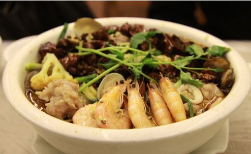 全家福,老板说这是海鲜的全家福,虾,花蛤,鱿鱼,肉片,花菜,木耳,荤素搭配,海鲜的川菜做法,味道很正哦。
