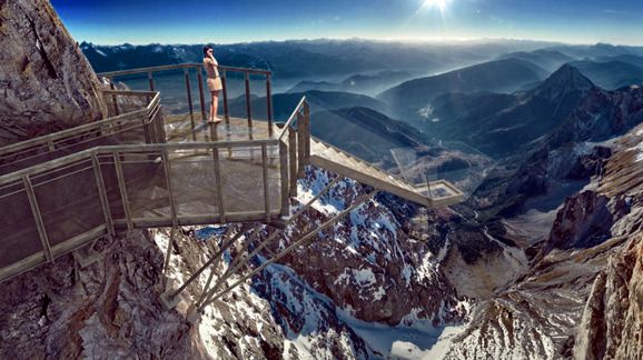 达赫斯坦冰川(Dachstein glacier)位于奥地利施蒂利亚州利岑县的Ramsau am Dachstein市镇,阶梯观景平台——虚无之梯(stairway to nothingness),是建在冰川上、向外悬空伸出的14级楼梯,周围有玻璃防护板。 该玻璃步道位于达赫施泰因冰川的一侧,被称为“阿尔卑斯山的阳台”,游客站在这里仿佛漫步云端。