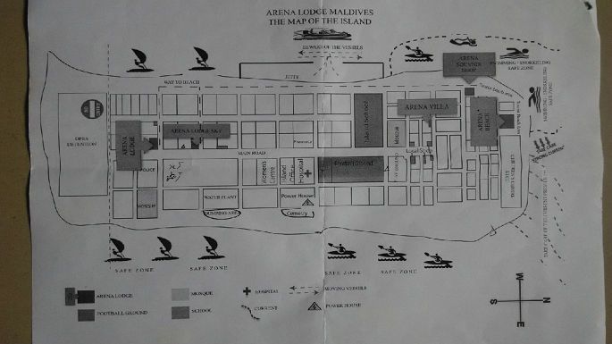 南马累环礁岛是一个有土著民居住的南北长东西窄的长形小岛 ,这是我们住的WHITESHELL酒店旁边的ARENABEACH酒店提供的平面图,这两家酒店在岛东端红房子的附近