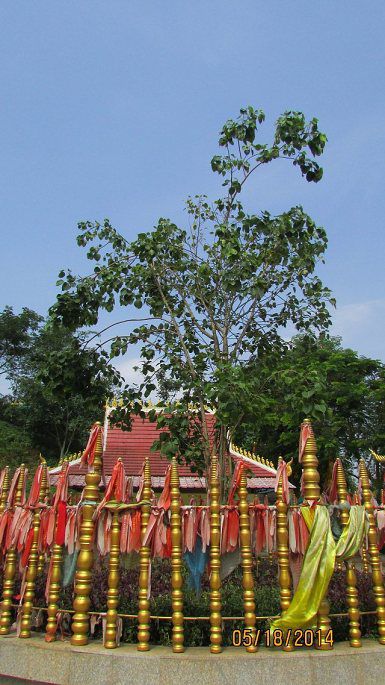 园内有一宝。当年释迦摩尼佛在菩提树下觉悟。正所谓菩提本无树,那树本叫毕波罗树,因佛祖在树下开悟,菩提即是梵语——觉悟的意思,所以将此树改名为菩提树。当年佛教大兴,斯里兰卡香火尤为繁盛,斯里兰卡信众远赴印度,在圣菩提树上取种回国栽种,若干年后,印度被阿拉伯人攻下,伊斯兰信徒将圣菩提树砍倒,焚毁。斯里兰卡的菩提树便成为圣树,从不轻易外借枝干。勐泐大佛寺重建时,我国派人远赴斯里兰卡求取圣树,因斯里兰卡与我国邦交甚好,同是礼佛之国,斯里兰卡慨然相赠,专机将圣树枝桠送到景洪,大佛寺在建时,圣树寄存在总佛寺,大佛寺建成后,移栽至此,如今已枝繁叶茂!