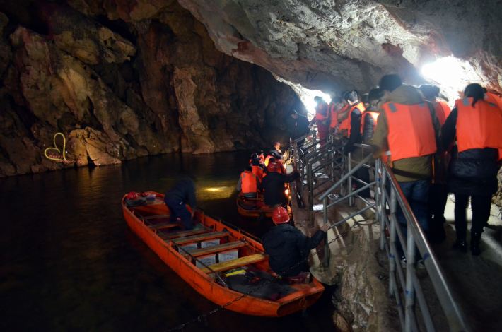 冠岩地下河坐小船里面没有灯光,一个给一个手电筒照亮