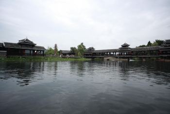 世外桃源景区是根据晋代陶渊明所著的《桃花源记》中描绘的意境,展示了一幅古桥、流水、田园、老村与水上民族村寨融为一体的画卷。