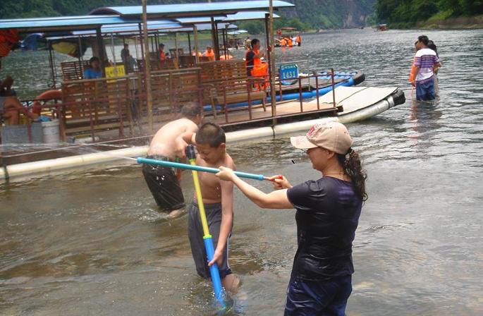 遇龙河:乘坐竹筏前,都要穿好救生衣,而且竹筏乘坐平稳,摆动的幅度非常小。其实有很多的船工都不会游泳,但是都长年累月的工作了那么久.不过在竹筏行驶中,要经过坝堤,所以大家一定要注意放好自已的相机和手机。因为下坝堤的时候会溅出很高的水花。最好是自己把双脚抬高,放入椅子上,以免溅到太多水花。