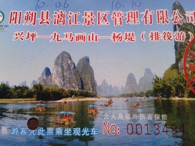 漓江竹筏漂流由阳朔县政府统一管理售票,政府的门市价是216元一人,我们提前通过网上找当地筏工师傅订的竹筏票是:杨堤到兴坪160元。