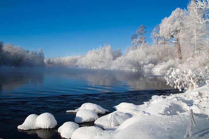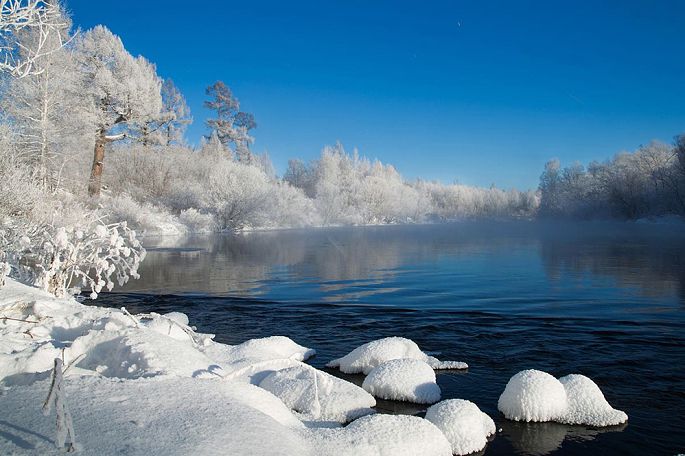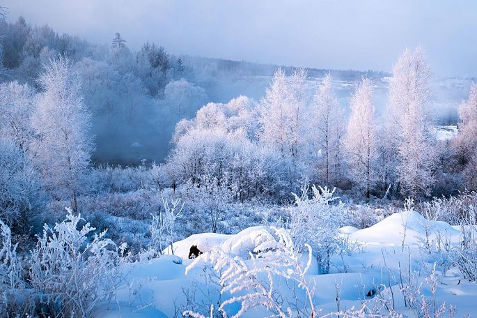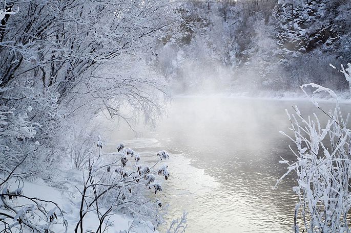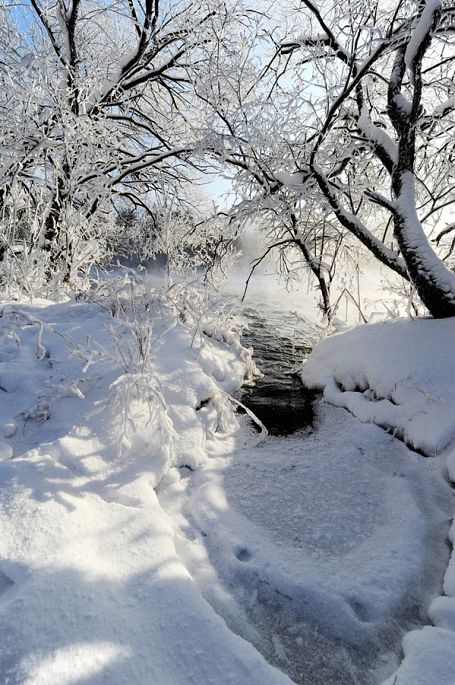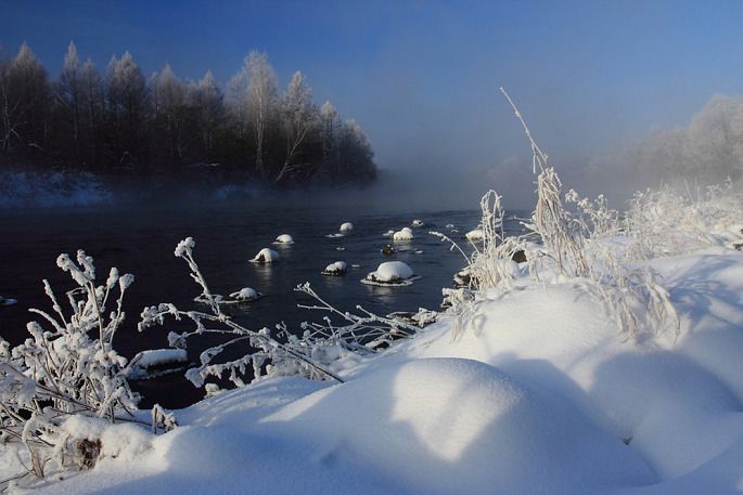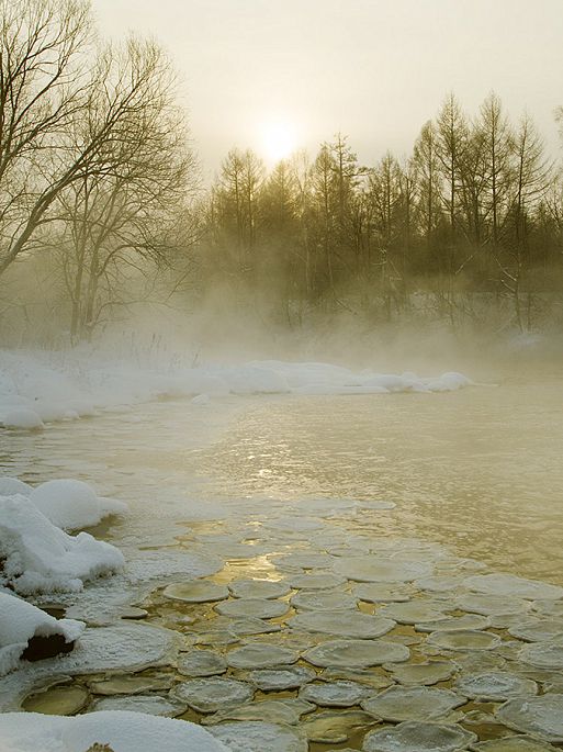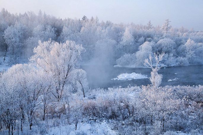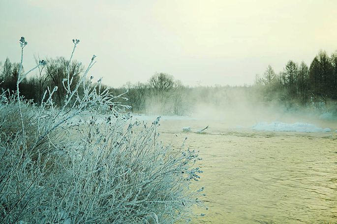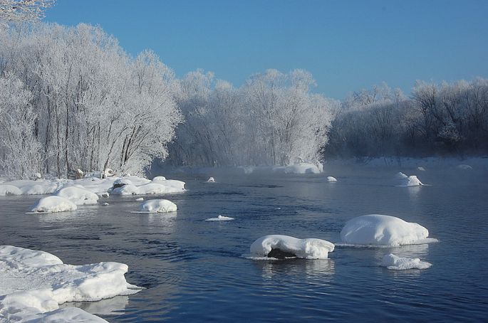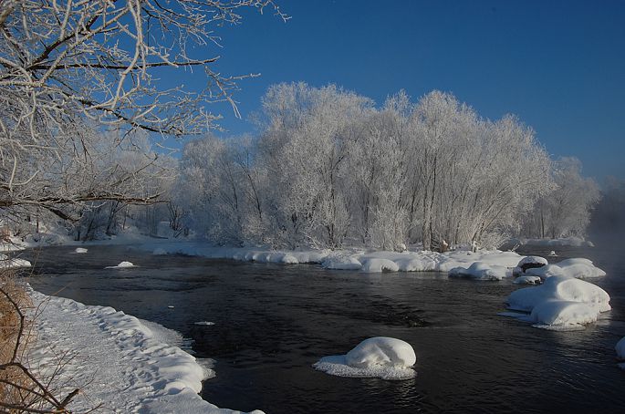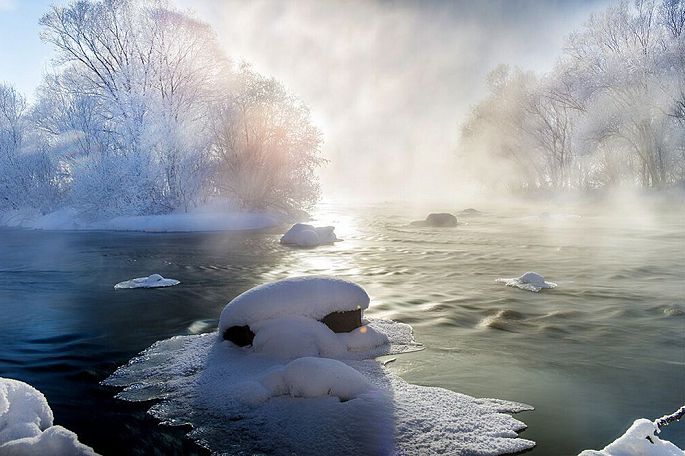 袅袅的轻烟从缓缓流动的河上慢慢升腾起来,汇成一片片雾气,在挂满雾凇的树林中盘旋缭绕,给人一种如临仙境的感觉。河上的石块,时隐时现,水中的倒影摇曳着梦幻般的景色。河水在静静流淌着,河床上铺着的雪更其洁白,河水却成了黑色,随河道悠然转折,若一条曲曲弯弯的黑色绸带,一直延伸到远方,将茫茫大地洇成一幅水墨丹青。