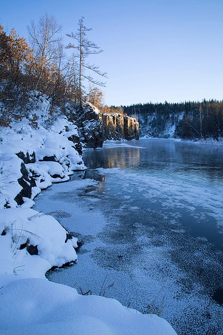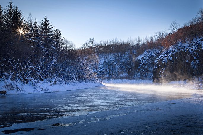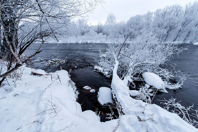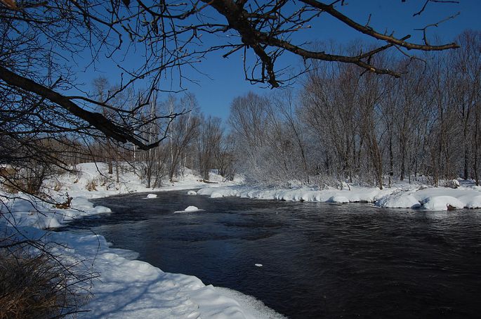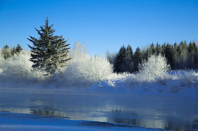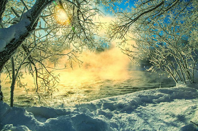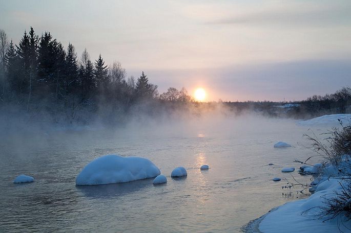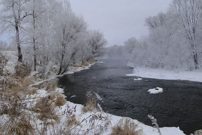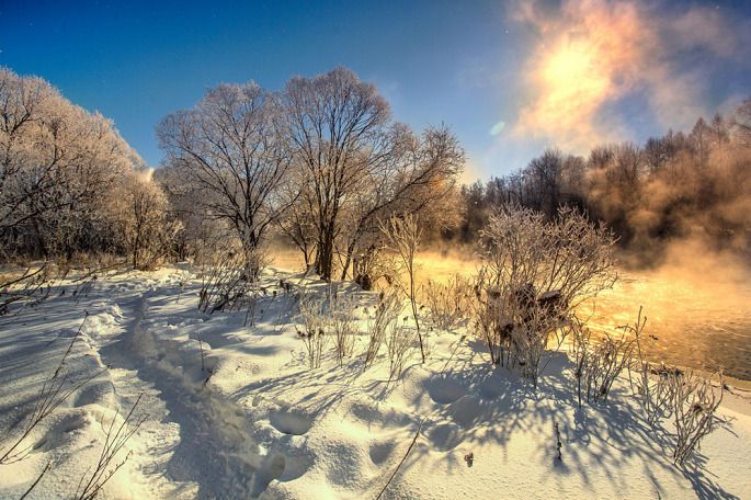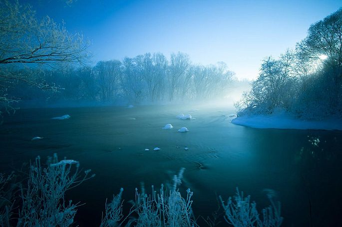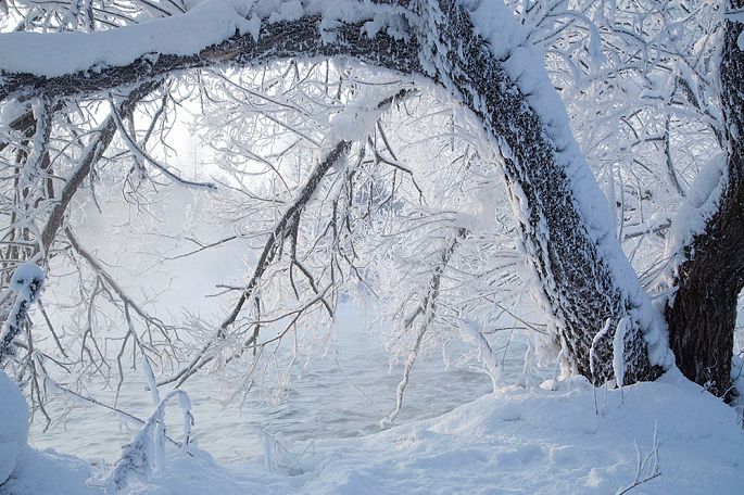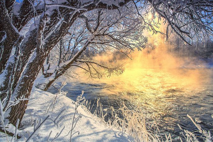 袅袅的轻烟从缓缓流动的河上慢慢升腾起来,汇成一片片雾气,在挂满雾凇的树林中盘旋缭绕,给人一种如临仙境的感觉。河上的石块,时隐时现,水中的倒影摇曳着梦幻般的景色。河水在静静流淌着,河床上铺着的雪更其洁白,河水却成了黑色,随河道悠然转折,若一条曲曲弯弯的黑色绸带,一直延伸到远方,将茫茫大地洇成一幅水墨丹青。