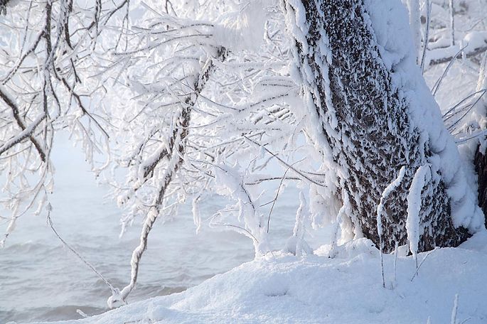 岸边是玉树琼枝,天然绣出的雪莲绽放在枝间,层层叠叠的冰花霜花,把人带入冰雪的梦幻。有的雾淞竟然有一寸长,纤纤地挂在蔓延的花技间,既柔又刚的美让人动情。