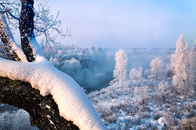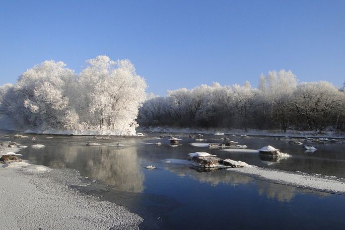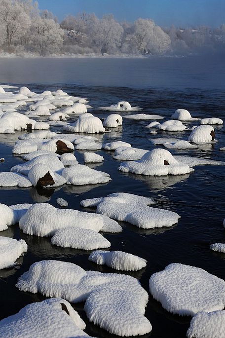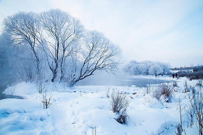 各类品种和形状的树上都挂满了雪白的雾凇,河里的石头上也盖着厚厚的白雪,整个河面白雾腾腾,经久不散。在一定气压、温度、风向等条件下,就会形成一条如诗如画的“雾凇画廊”,使人仿佛进入了如梦如幻的仙境一般。