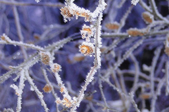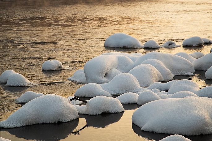 库尔滨的冬天只要是上游的水库放水,几乎天天都有雾淞景观出现。那里是一片适合雾淞滋生的水畔,片片霜花绽放在树枝间,开在水中的石头上,甚至还挂在游人的睫毛上。