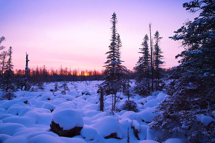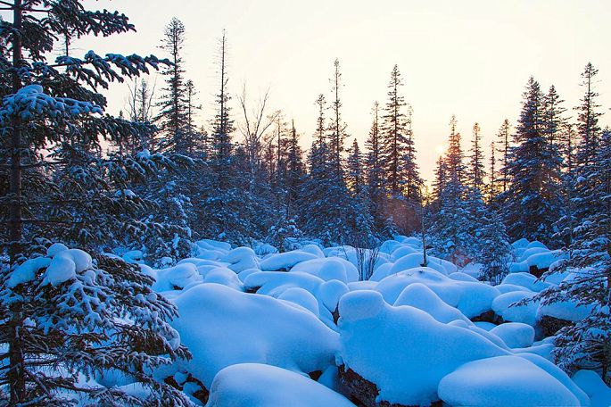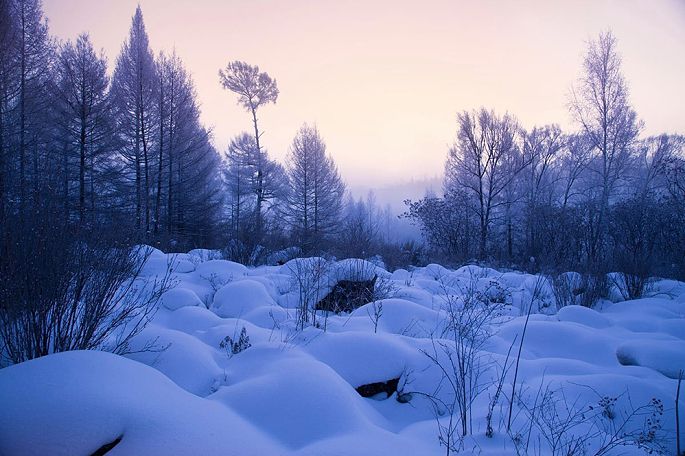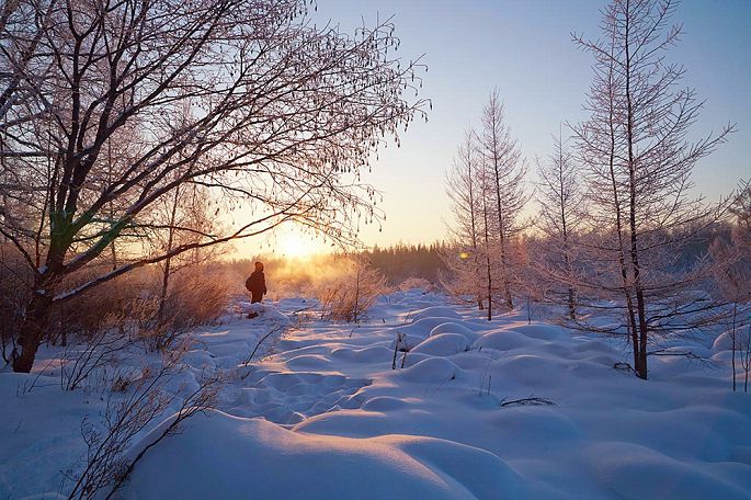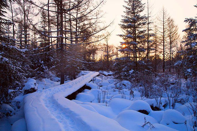 当夕阳将要西下时,天地之间变得莫名的恬静,也莫名的忧郁,如小提琴弦上泠泠演奏的乡村乐曲。一缕高光打在白桦林的林梢,夕阳映照在白雪覆盖下的火山熔岩群上,那种静美让你会完全地沉醉在其中不能自拔,甚至于呼吸,都变得轻柔起来。