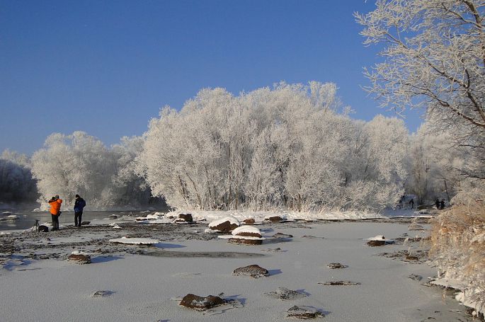 再看那河面上,晨阳里,云雾般的蒸气在河面上氤氲着、舞动着、飞翔着,冰冷的库尔滨河在清晨里仿佛沸腾了一样抒发着冰与火的激情。这冰冷,是零下30度的严寒;这火热,是人们被这美丽激发的热情。如果你看到沿岸的摄影人那种忘我的投入,你就会知道这份美有着怎样的魅力了。