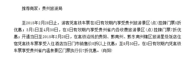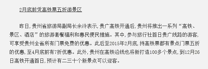 今次游玩,我必须要吐槽的就是:买门票的景点并没有出示凭贵广高铁票五折优惠的牌子或者字眼(黄果树除外),售票的服务员也不会告诉你有这么一项优惠政策,所以大家必须要主动提出。用载我们到达黄果树景区司机的话去形容:“简直就是坑爷爷奶奶的”,一点也不过分!个别媒体的报道,也有误导倾向(如上图),只顾着大卖5折,却不告诉我们老百姓那是有潜规则的:“凭高铁票上打印的日期5天之内玩各景区才可以享受5折优惠,否则是没有优惠的!!!”我是7号出发的票,12号到达黄果树景区买票,居然狠狠地被告知:不可以享受五折优惠,已经过期了!(即7-11号期间才可以享受)当时真的感觉自己被一些无良媒体欺骗了!!!好吧,都怪我在出门前没有将这个门票优惠政策看透。以下是我在网上所找的精确消息,写出来,希望大家都要注意优惠的时间。