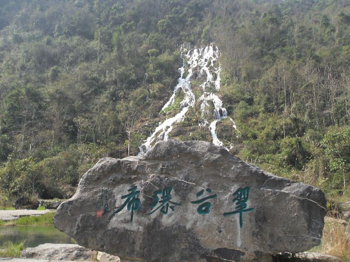 翠谷瀑布挂于青山腰上,水顺着山势倾斜而下。