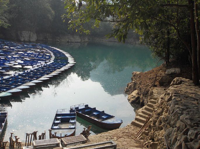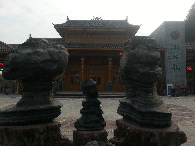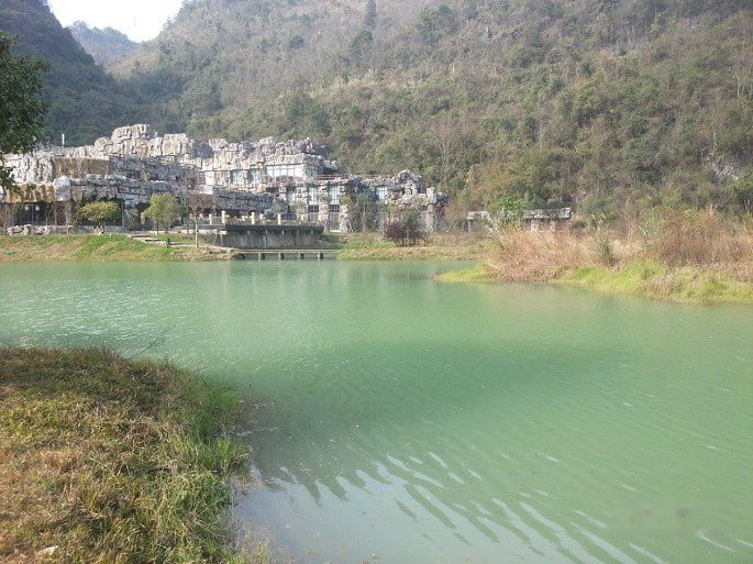 前往鸳鸯湖后,发现湖里摆满了小船,淡季有工人在加紧制作小船,这湖感觉很一般,完全可以把它忽略。天钟洞在它的附近,我们没什么兴趣,同时也担心时间不够,也就没去。