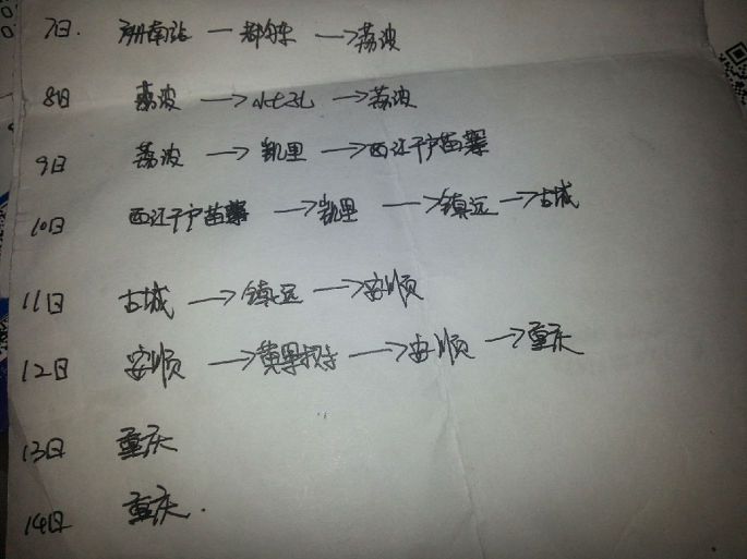 苗寨——凯里汽车站(15.5元/人,每隔一小时/班车。)——在汽车站对面的公车站乘坐1路公交车到达总站凯里火车站用时约25分钟——镇远火车站——走出火车站小广场在右手边马路拐弯处打的(5元/人)到达新大桥——入住客栈,放好行李——吃晚餐并在餐后爬山看古城夜景以及沿着河边散步。