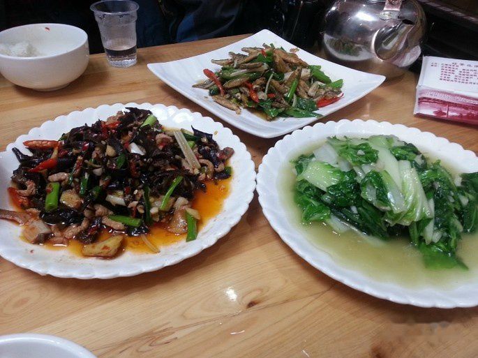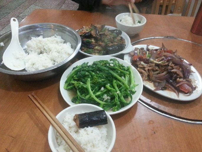 中午没有好好吃饭,在住处楼下的小餐馆点餐吃晚饭,非常的便宜,一大叠的青菜才10元,一顿饭下来45元,我俩可都是很能吃的娃儿呀!