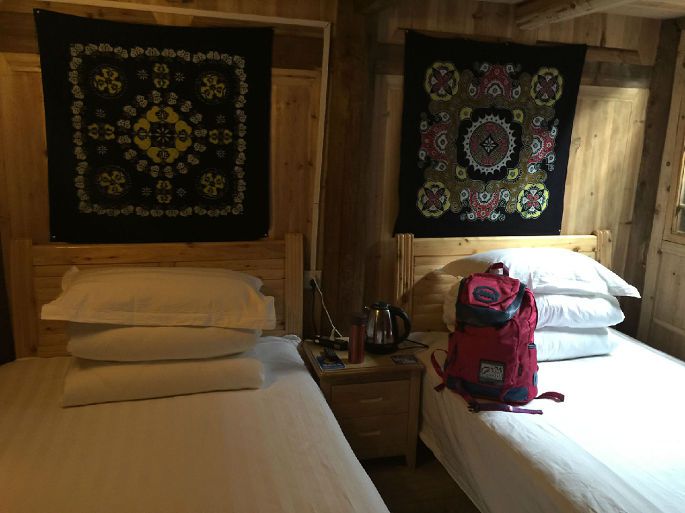 他们家的客栈很具有苗族风格的同时也不失文艺风。入住的时候,被他们发信息提示给逗笑了:3岁以下的小孩可以体验苗家小背篓,萌妹子免费拎包,男的则加QQ发地图自爬。年轻人爬爬山坡还是挺好的,一路皆风景,值了!如果携老带幼的话,则要慎重考虑了。