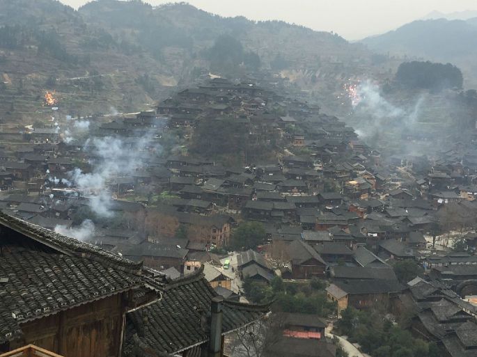 看完表演以后,我们沿着大路一直往下走,然后搭乘观光车到观景台去苗寨风景。虽然天色不算很好,苗寨的风景依然清晰可见,蔚为壮观的建筑群错落有致地分布在山的对面。