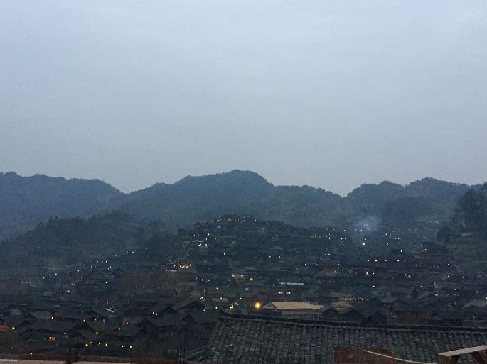 夜色朦胧时,我们打道回府吃东西咯!据闻客栈里有个掌勺的苗家大厨,每逢寨里有重大节日,都会参与下厨。只是,能否有幸吃上美味佳肴,那就得看运气了!加了他们家的微信,一心想去尝尝舌尖上的中国里面所说的“糯米稻花鱼”,不料,去到以后才知道发酵的时间还没到!没有如愿吃上,有点小失望。在他们家搭食30元/人,虽吃不上想吃的菜肴,但地道的苗家酸汤鱼我总算是吃上了。贵州以酸辣为主,酸汤鱼的酸主要是搭配了番茄在里面,喜欢吃辣的就沾着大碗上面的辣椒酱吃。里面可放鱼肉、豆腐、青菜,天气冷,大家围着吃饭跟吃火锅有点儿相似。