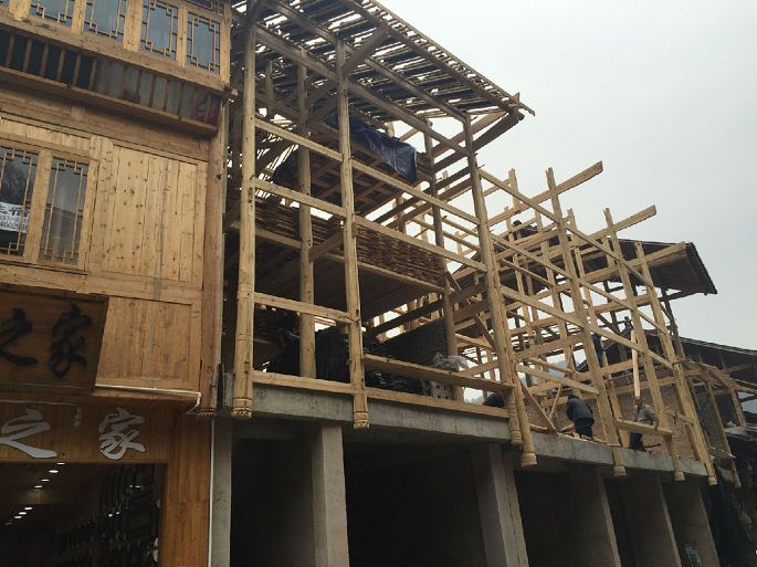 西江千户苗寨的苗族建筑以木质的吊脚楼为主,为穿斗式歇山顶结构。分平地吊脚楼和斜坡吊脚楼两大类,一般为三层的四榀三间或五榀四间结构。西江男人有两门绝活,一门是修建吊脚楼,一门便是打造银饰。西江男人建的吊脚楼为全木结构,不钉不铆,雄奇壮观。在游街走马观花的时候,刚好看到街边的房子正在建设中,我可是大开眼界了。