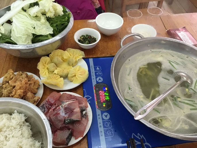 类似于吃自助火锅,只是汤底跟我们平时吃的有区别而已。喜欢吃什么,自己从冰柜里面拿。俩人只吃了54块,却已经饱得肚子圆鼓鼓的了!还想着晚点尝尝江边烤鱼,结果爬完山、看完夜景回来肚子还是很饱,完全没有想吃烤鱼的冲动,而是跑去客栈附近的牛奶店去买酸奶喝。