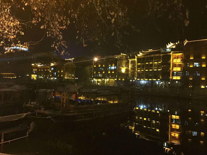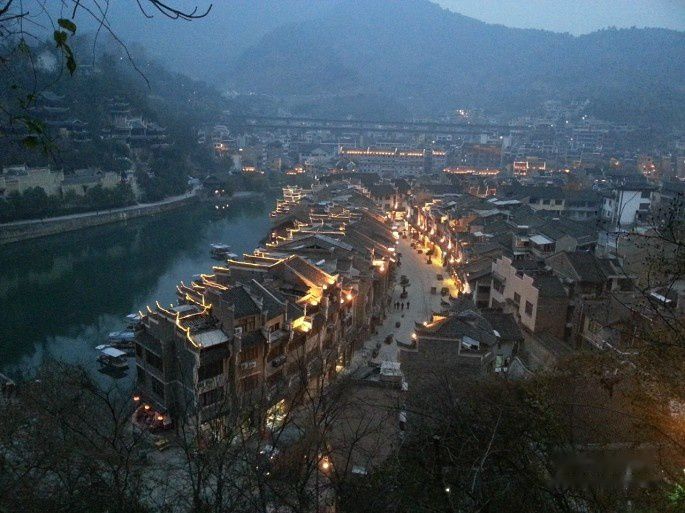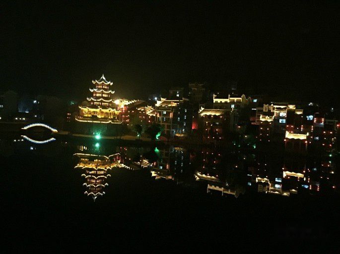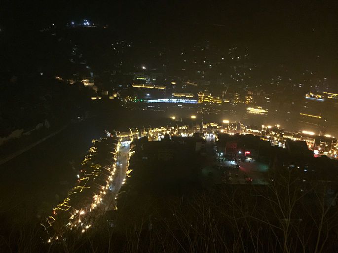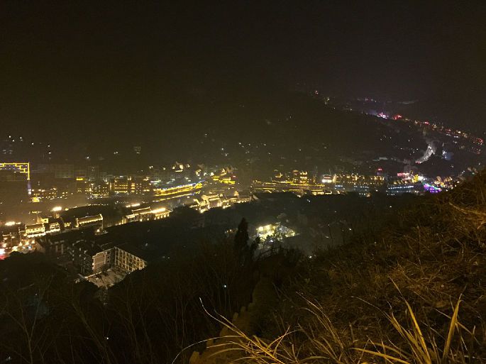 吃饱后,我们走过新大桥往石屏山的方向走。石屏山,位于贵州省镇远县舞阳镇舞阳河东侧,属祁连山系,重岩叠障,雄伟 险峻。东西绵延2.2公里,主峰海拔668.1米,与舞阳河面相对高差204米。石屏山面城一面的北山,象一个大屏风,竖立在山中。石崖绝壁高千仞,得名“端直苍阔如屏风”。由于是晚上爬山,因此完全看不清这山究竟是长什么样的,只知道在爬山的过程中,沿途只有一个风景,那就是由上往下所见的小城夜景图。