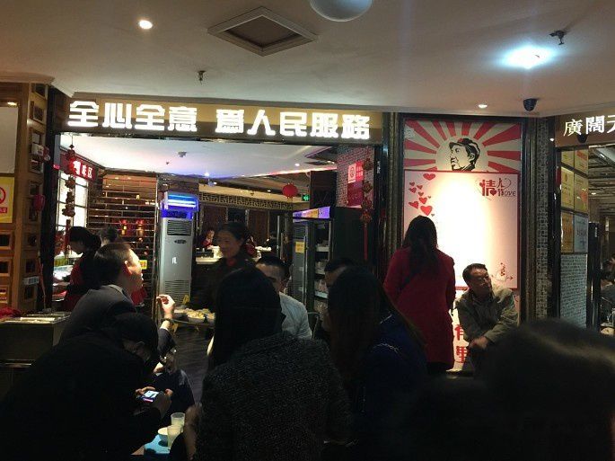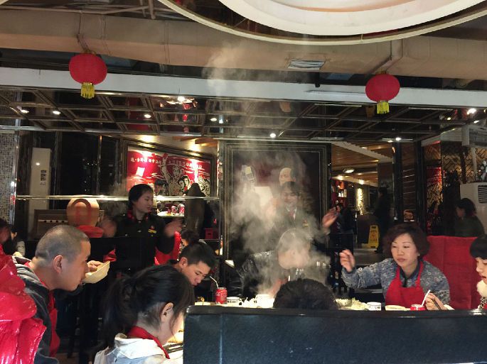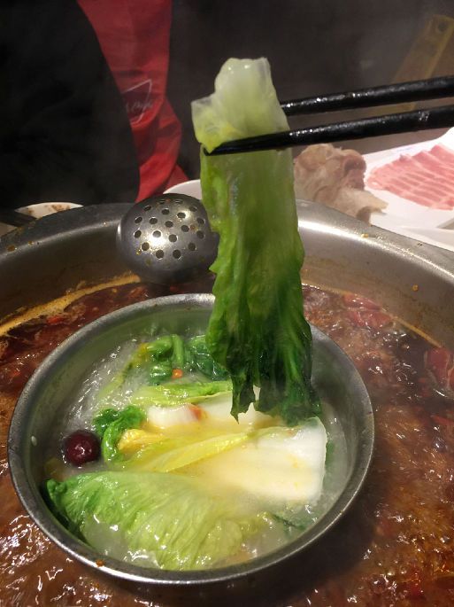 晚餐时间到了,那位朋友带我们到伍仙桥附近的一家名为“下乡改善伙食”的火锅店吃东西。一进去,全场坐无虚席,并坐着很多等候的人。在等候的过程中,会有服务员不时走过来免费送茶水、小吃。