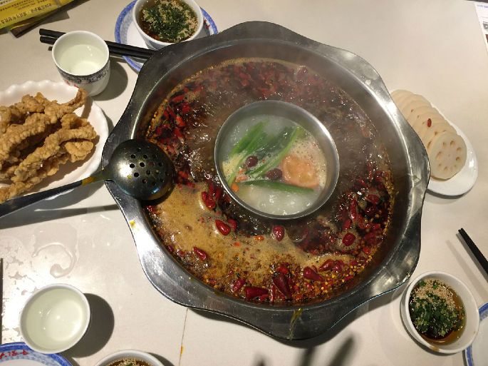 那位朋友向我们介绍,如果吃不了太辣的酱料,那就加点麻油、加点醋、加点芝麻,加点葱花也就足够了。他说,为什么重庆的人的皮肤会那么好,其实是与他们经常吃火锅有一定关系的,因为火锅里面的药材有益身心。
