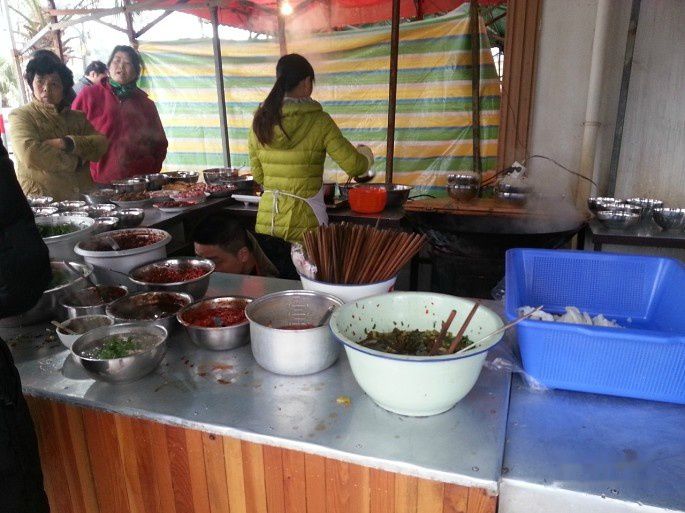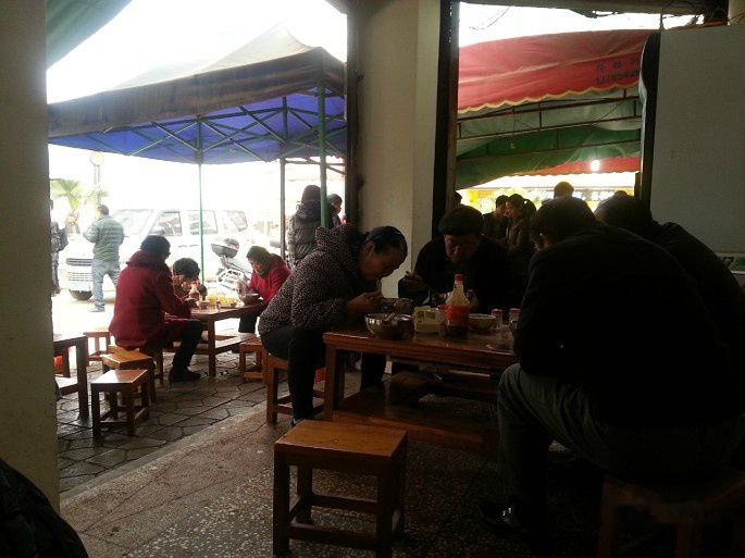 我们是下午一点钟的火车,为了让时间充裕点,我们七点起床,洗漱完毕后就从客栈下山至主干道。环顾四周,卖早餐的店铺不多,最后随便进了一间稍微有点人气的店里坐下,各自要了一碗汤粉。吃饱后,我俩都觉得肚子还是饿啊。本想着,再逛逛周围看还有没有好吃的,然后再买,很可惜的就是,当地虽然有卖本土特色小吃,可看着那些食品却怎么也提不起食欲,于是什么都没买,转了一圈也就回客栈收拾行李了。