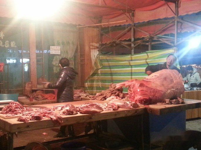 第二天早上,我们要赶8点出发到凯里的车,为了吃上牛肉粉,我们六点就爬起来洗漱,去到那儿,天色还没完全亮,因此可以看到隔壁老板正忙于分解一头大牛。